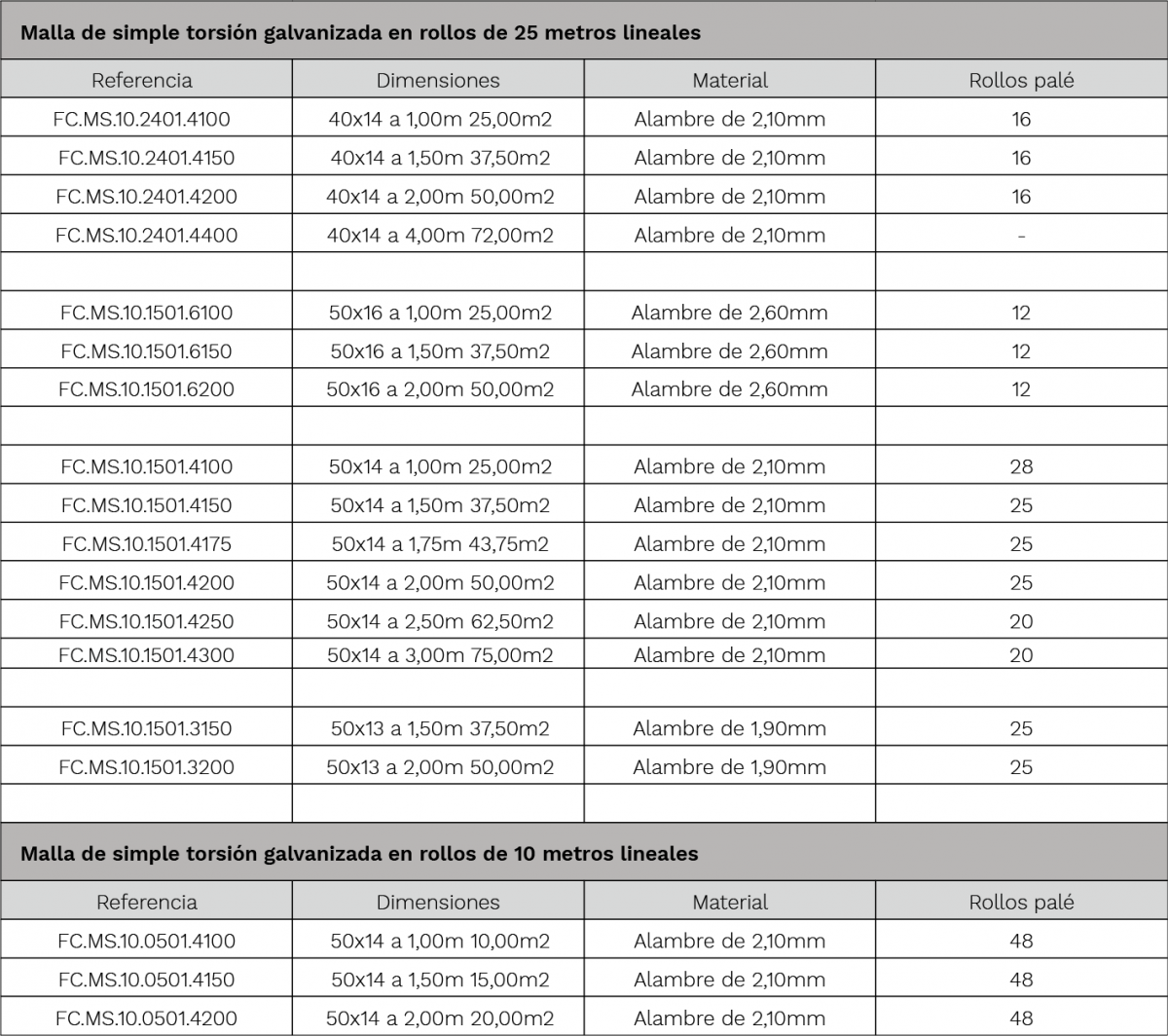 Malla fabricada con alambre galvanizado con resistencia a la tracción de 40-55 kg/mm² y con recubrimiento mínimo de zinc de 40-50 gr/m².
