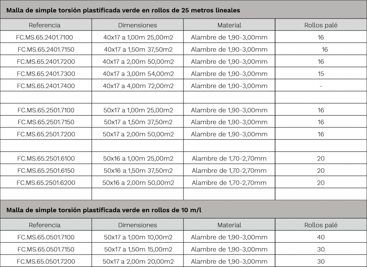 Malla fabricada con alambre galvanizado con resistencia a la tracción de 40-55 kg/mm² y con recubrimiento mínimo de zinc de 40-50 gr/m².