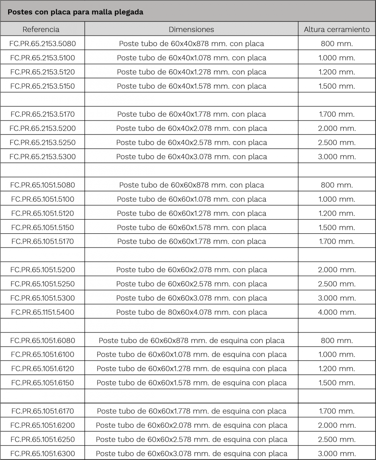 Postes para malla plegada de tubo 60×40, 60×60 y 80×60 mm., según altura del cerramiento. Disponibles con placa de anclaje para atornillar.