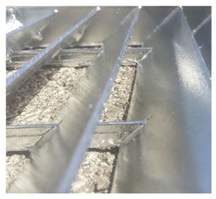 La rejilla tipo persiana combina pletinas portantes y pletinas separadoras en disposición que permite una menor visibilidad directa, sin comprometer la ventilación. Formato de cuadrícula 30×30 mm, fabricada en acero galvanizado electrofundido.