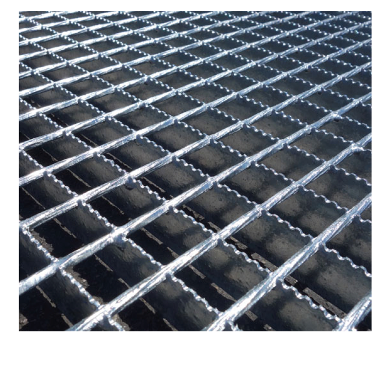 Peldaño metálico fabricado con rejilla Tramex dentada, compuesto por pletinas portantes dentadas y varilla corrugada soldada perpendicularmente, formando cuadrícula de 30×30 mm.