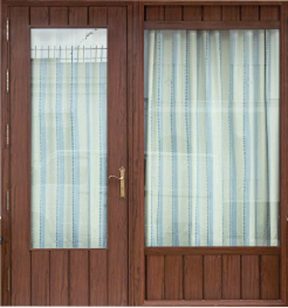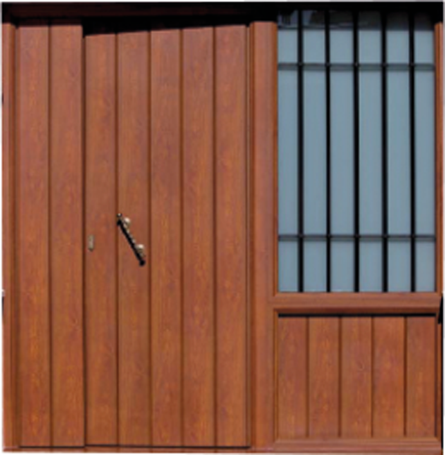 Incluye bisagras antipalanca, cerradura de seguridad embutida (uno o tres puntos), escudo antitaladro y juntas de goma para hermeticidad total. El perfil de aluminio exterior tiene un espesor de 2 mm y se compone de lama, tapeta y marco reforzado.